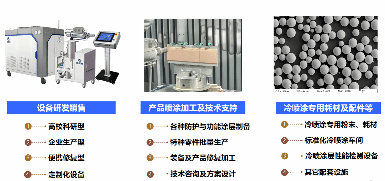 冷喷涂固态增材制造技术,以其高效率、高质量、低成本、绿色环保等技术特征,在保护涂层、功能涂层、零件修复和增材制造等领域具有广阔的应用前景。斯赛姆科技拥有成熟的冷喷涂工艺研发体系和设备生产能力,为客户提供原位快速修复、功能/保护涂层制备、增材制造、替代电镀等技术服务和生产加工;提供完全自主知识产权的便携式冷喷涂设备、高压冷喷涂设备、冷喷涂喷丸设备等。斯赛姆科技始终坚持以客户需求为导向,为客户提供定制化的解决服务方案,满足不同行业、不同场景下的多样化需求。