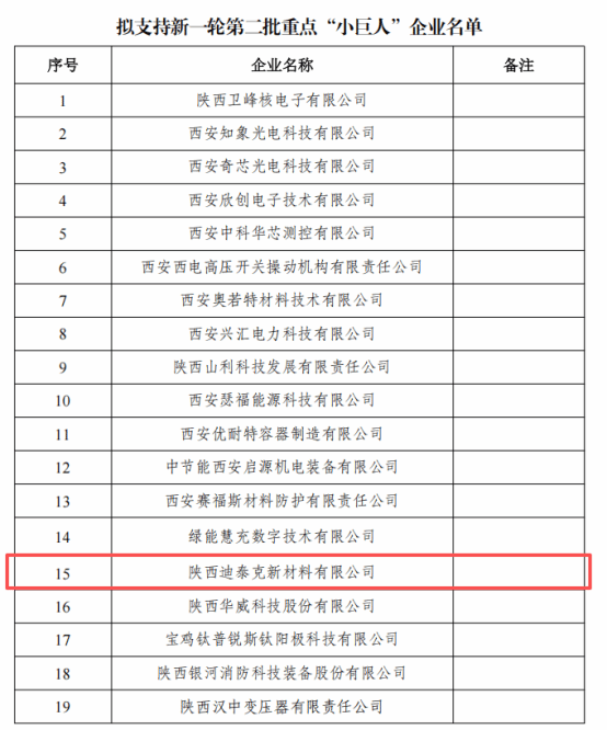 10月10日,国家工业和信息化部评审结果陕西省工业和信息化厅发布了《关于2025年拟支持新一轮第二批重点“小巨人”企业名单的公示》,陕西迪泰克新材料有限公司位列其中,跻身专精特新企业梯队中的“尖兵连”,标志着企业在γ射线辐射探测与X射线光子计数成像领域持续深耕、攻坚“卡脖子”技术、构建完整技术生态等方面获得国家层面进一步认可。