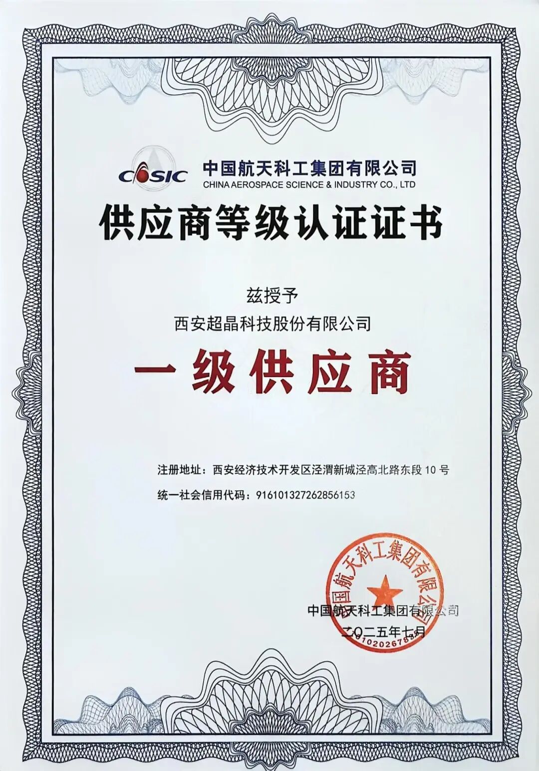 西安超晶科技股份有限公司荣获中国航天科工集团“一级供应商”等级认证,标志着其企业资质、研发能力及生产管理水平获权威认可。