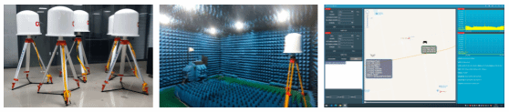 信号侦测和定位设备(左)、微波暗室内测量(中)、上位机软件界面(右)