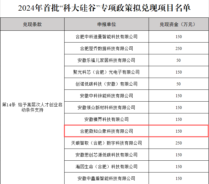 近日,合肥市发展改革委发布《关于2024年“科大硅谷”专项政策拟兑现首批项目名单的公示》,我校成果转化企业合肥微知众象科技有限公司成功入选。
