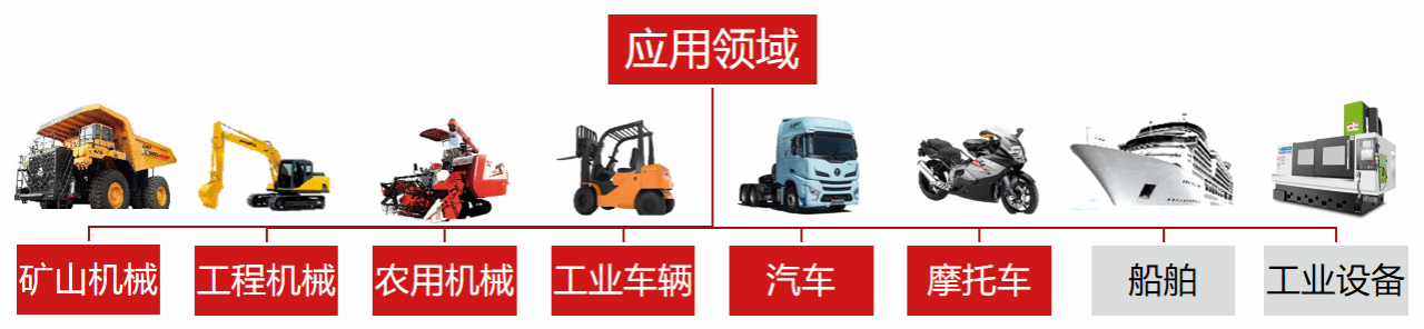 公司产品广泛应用于各类机械的传动及制动装置,包括矿山设备(矿用卡车、防爆运输车等)、工程机械(挖掘机、装载机等)、农用机械(拖拉机、收割机等)、车辆(叉车等)、商用车(重卡AMT变速箱、客车、离合器、制动器)、乘用车(自动变速箱、液力变矩器)、船舶及工业装备(液压马达、扭矩控制器等)。