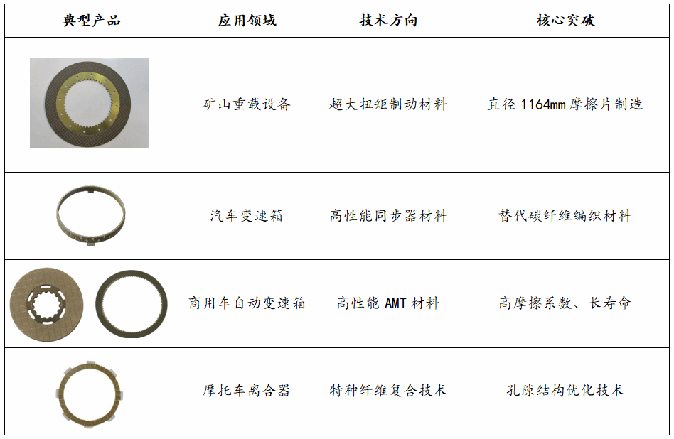 纸基摩擦材料是一种采用造纸工艺技术生产的新型摩擦材料,由纤维、粘结剂、摩擦性能调节剂等组成,具有摩擦系数高、结合平顺性好、使用寿命长、低噪音、低成本等特性。公司累计开发400余款摩擦片,产品覆盖军民两用领域。国内首创将碳纤维应用至纸基摩擦材料中,利用碳纤维比强度高、导热性好和自润滑性的特点,研发了高耐温、低磨损、高摩擦系数等系列材料,技术处于国内领先水平。产品攻克了碳纤维增强纸基摩擦材料在高温、高负荷、湿式工况下的稳定性技术瓶颈,解决了传统纸基摩擦片在极端工况下磨损快、摩擦系数波动大的行业痛点,部分性能达到国际先进水平,可全面替代进口产品。