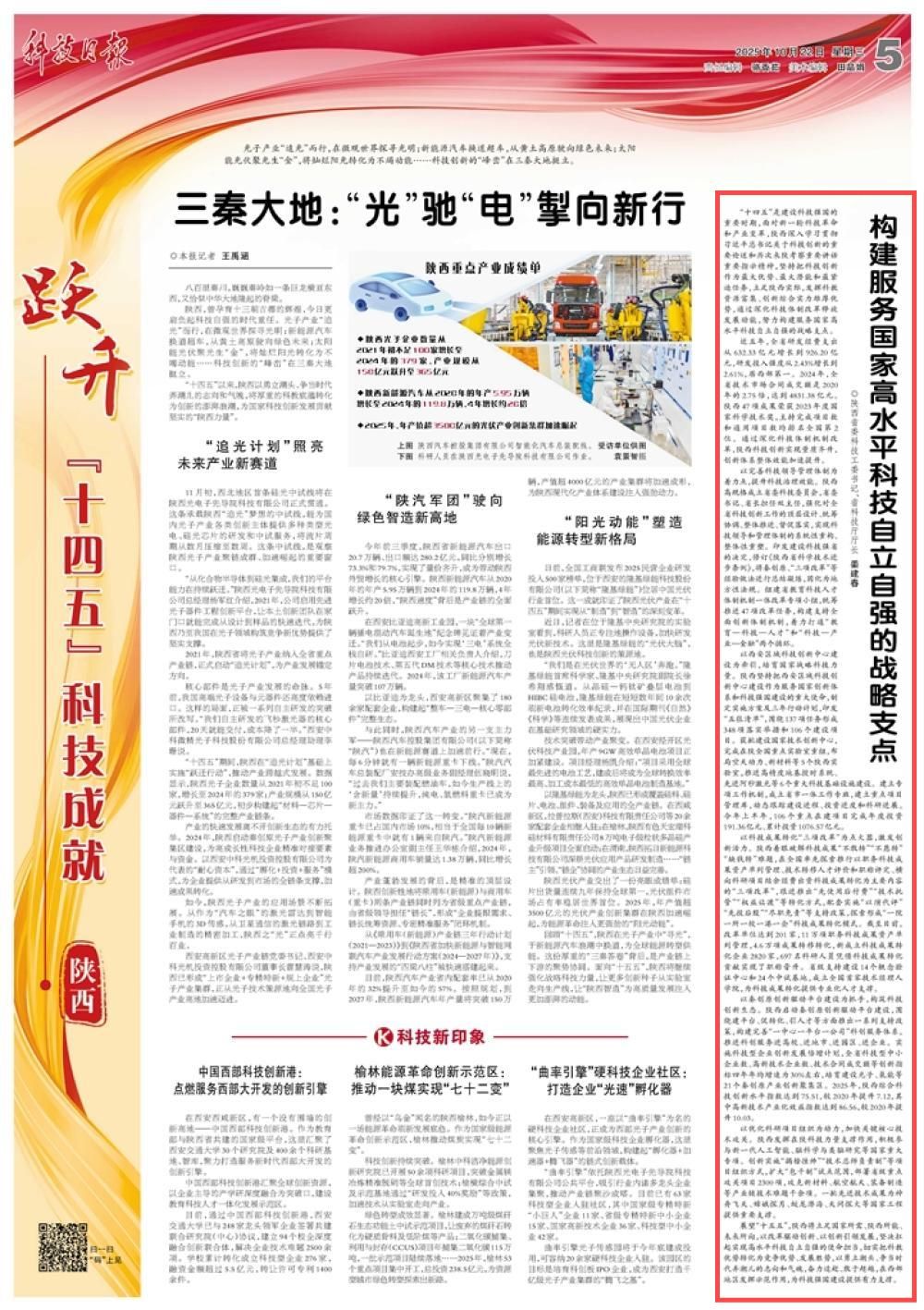 10月22日,《科技日报》刊发《跃升 “十四五” 科技成就(陕西)》专题,报道了陕西省委科技工委书记、省科技厅厅长姜建春署名文章《构建服务国家高水平科技自立自强的战略支点》。文章提到: