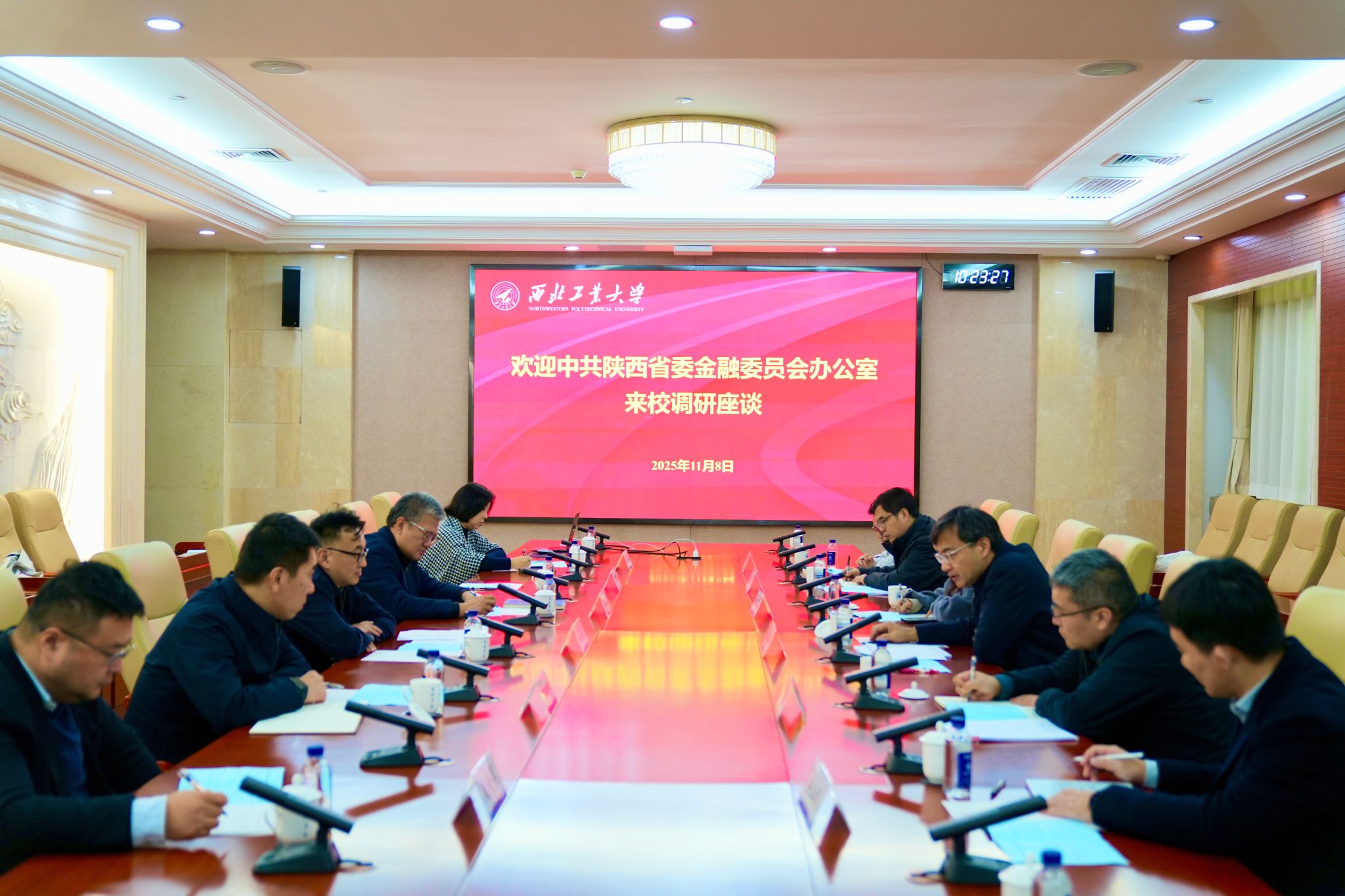 省委金融办、省证监局、北京证券交易所西北基地和陕西资本市场服务中心以及学校资产公司、西安因诺航空科技有限公司、西安羚控电子科技有限公司、西安超晶科技股份有限公司、陕西欧卡电子智能科技有限公司和陕西迪泰克新材料有限公司的相关负责人参加座谈会。