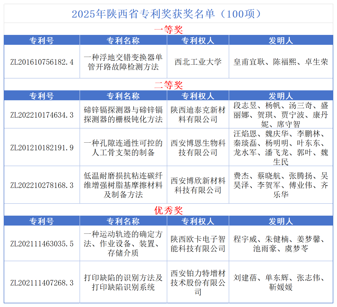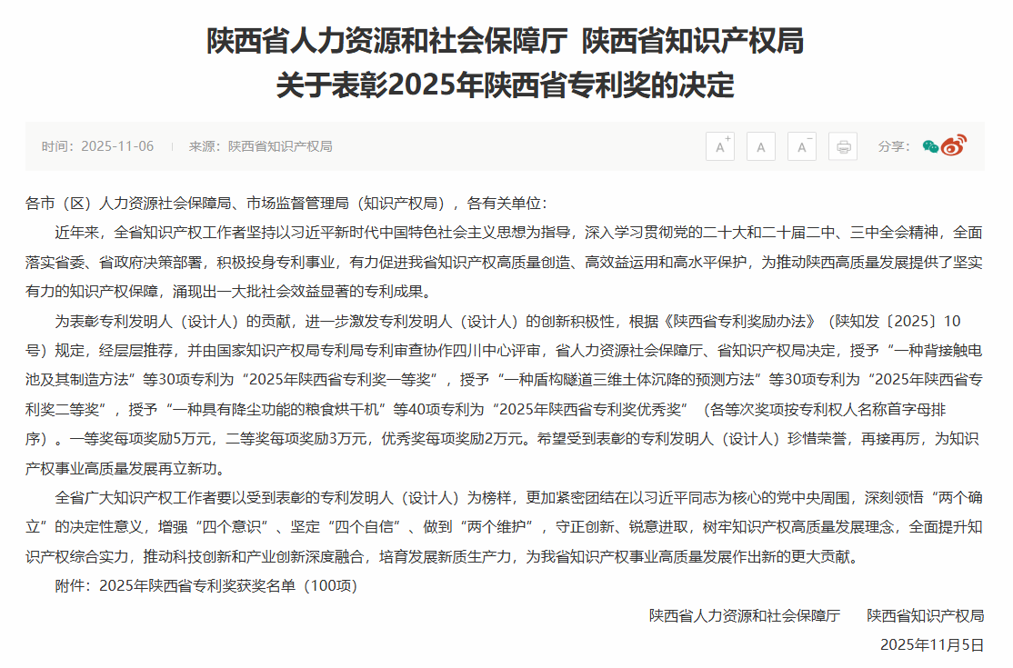 陕西省专利奖是由陕西省知识产权局组织评选的省级重要奖项,每三年评选一次,设有一等奖、二等奖和优秀奖三个等级,每次奖励项目总数不超过100项。该奖项表彰在专利高质量创造和高效益运用方面取得突出成效的专利项目。