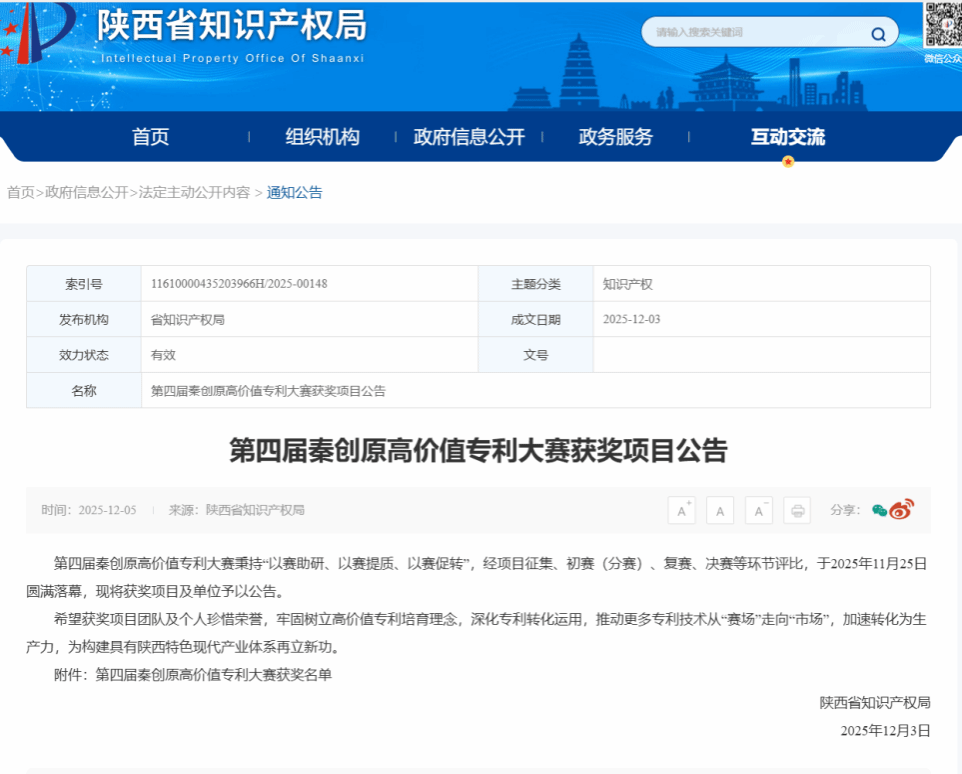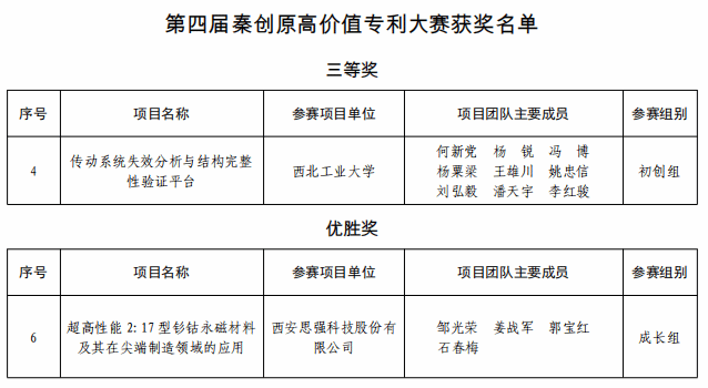 近日,陕西省知识产权局公布第四届秦创原高价值专利大赛获奖名单。我校与成果转化企业西安思强科技股份有限公司的2个项目从346个参赛项目中脱颖而出,分别荣获三等奖和优胜奖。