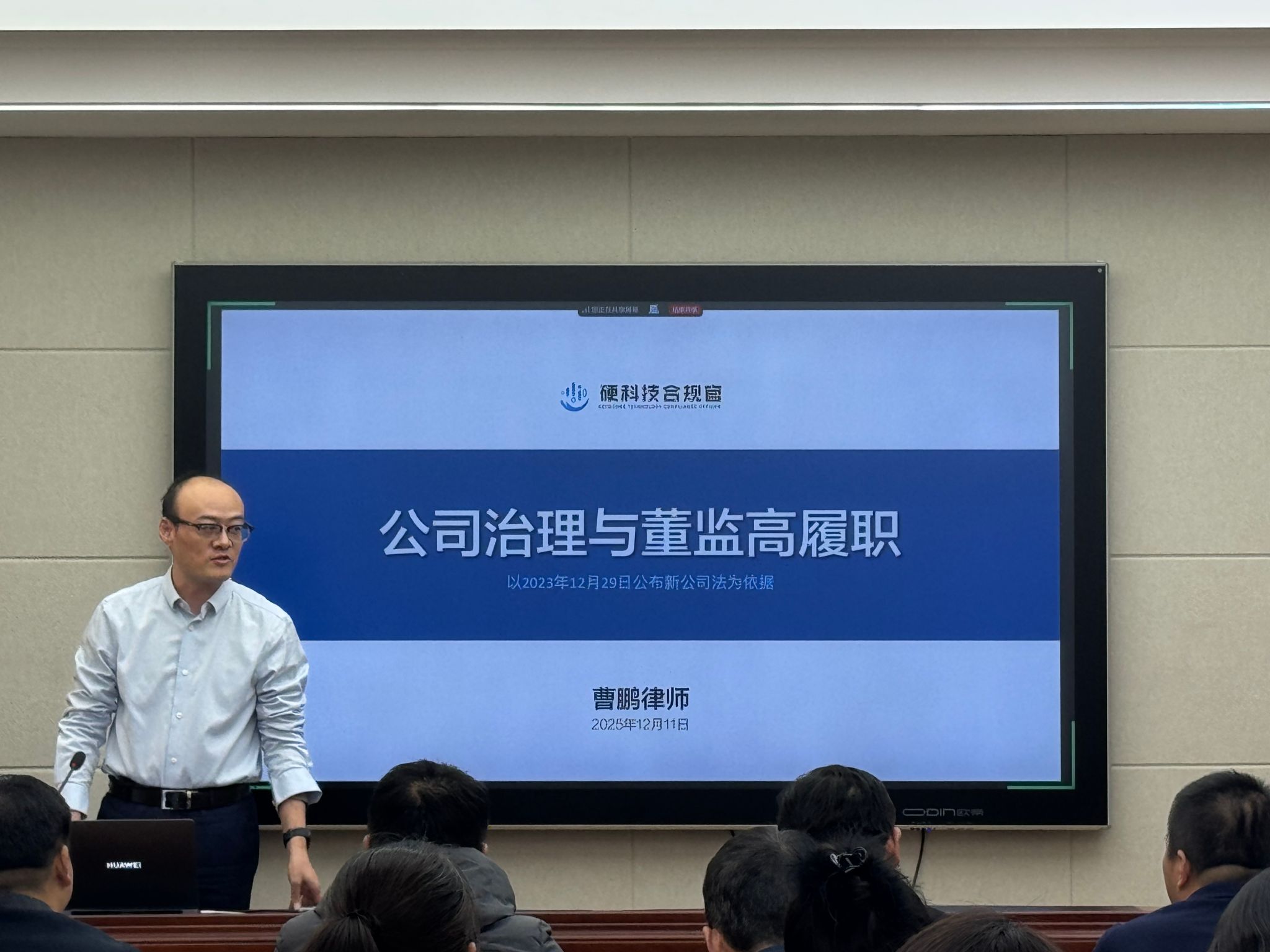 培训主讲人为陕西稼轩律师事务所副主任、知名公司治理专家曹鹏律师。曹鹏从阐释公司治理基本概念入手,重点讲解法定代表人的职责和权限,股东会、董事会、监事会运行机制,“三重一大”和党组织前置研究等内容,重点强调了企业董监高的职责和忠实勤勉义务,及其在履职过程中需要规避的法律风险、承担的法律责任等。