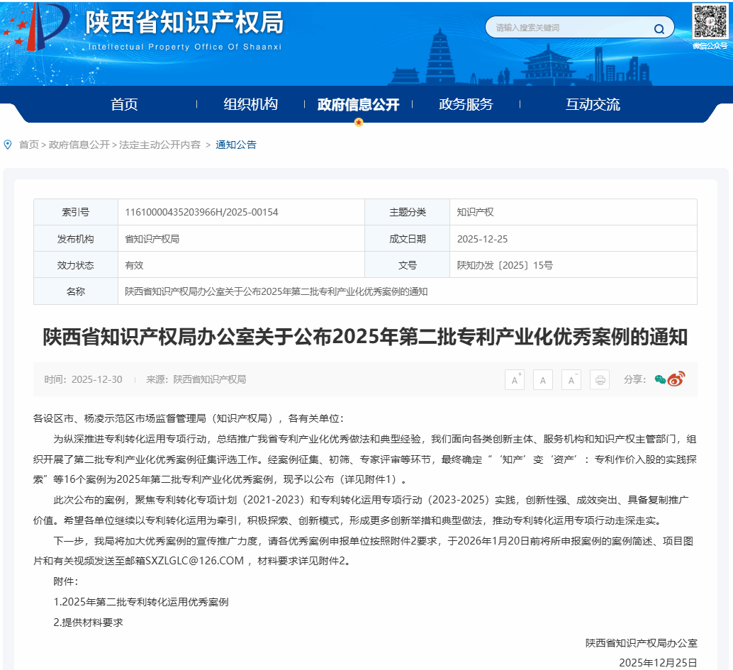 近日,陕西省知识产权局公布2025年第二批专利产业化优秀案例,陕西西工大科技园有限公司报送的“知识产权一站式服务促进专利产业化”案例成功入选,这是继我校首批入选案例“从实验室到市场的成功实践”后,第二次获评陕西省专利产业化优秀案例,充分体现了学校在知识产权转化与产业化方面的持续探索与成效。