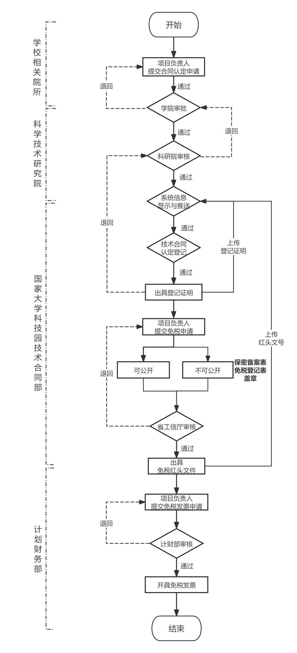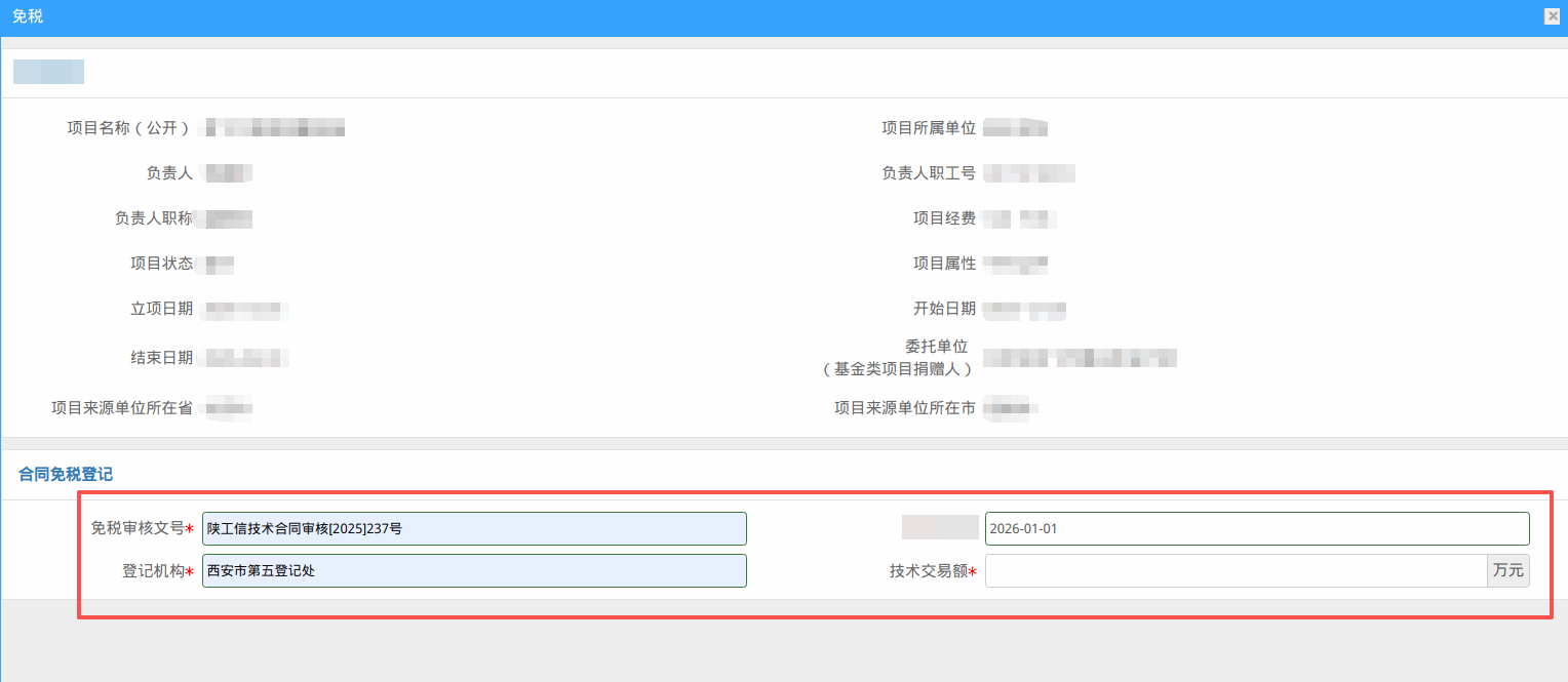 技术合同部根据科研系统中提交免税合同的数量,每月定期前往陕西省工业和信息化厅办理免税申请,待收到《技术合同认定审核意见的复函》红头文件后,将红头文号录入科研系统,同时抄送红头文件至计划财务部。申请人即可依据红头文号在科研系统提交免税发票申请,计划财务部审核通过后,根据核定技术性收入开具免税发票。