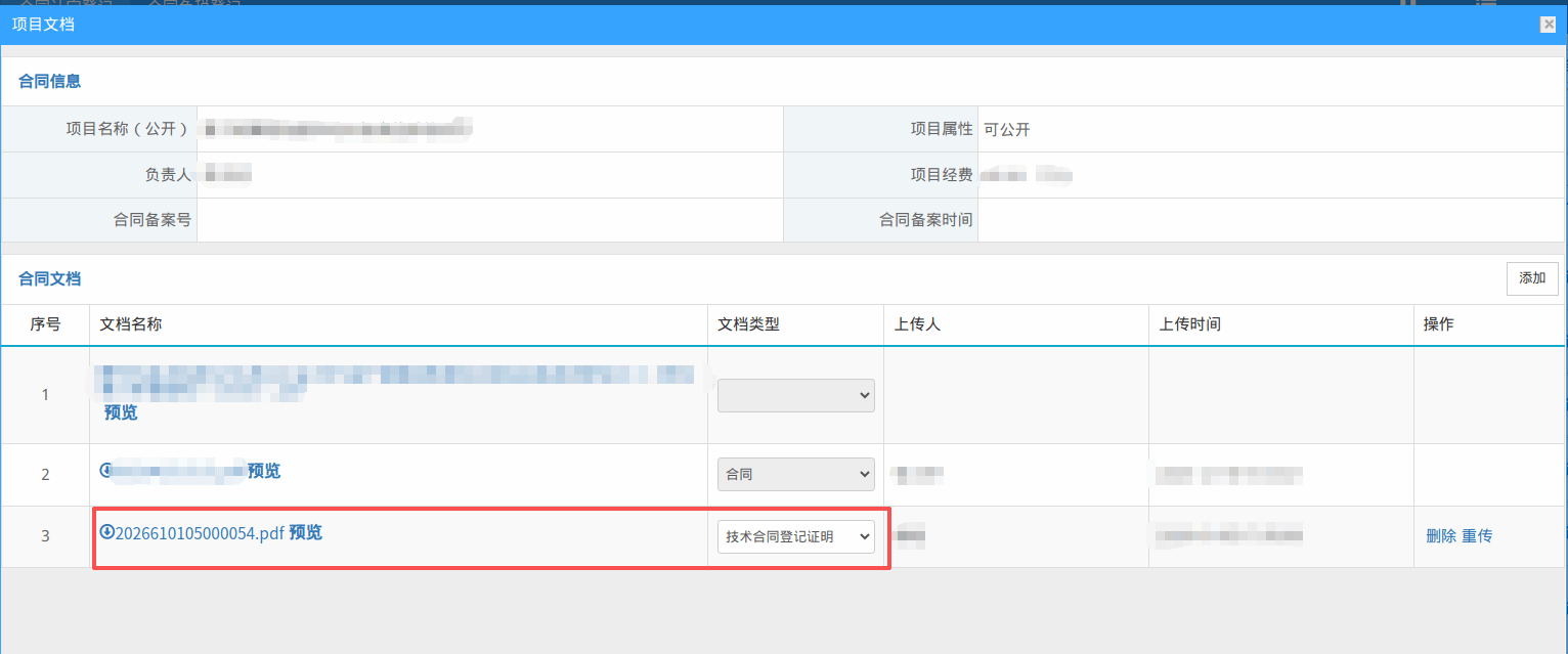 技术合同部对合同进行认定登记,审核通过并出具《技术合同登记证明》,逐份回传科研系统后,申请人可在个人科研系统——项目文档中查阅《技术合同登记证明》。