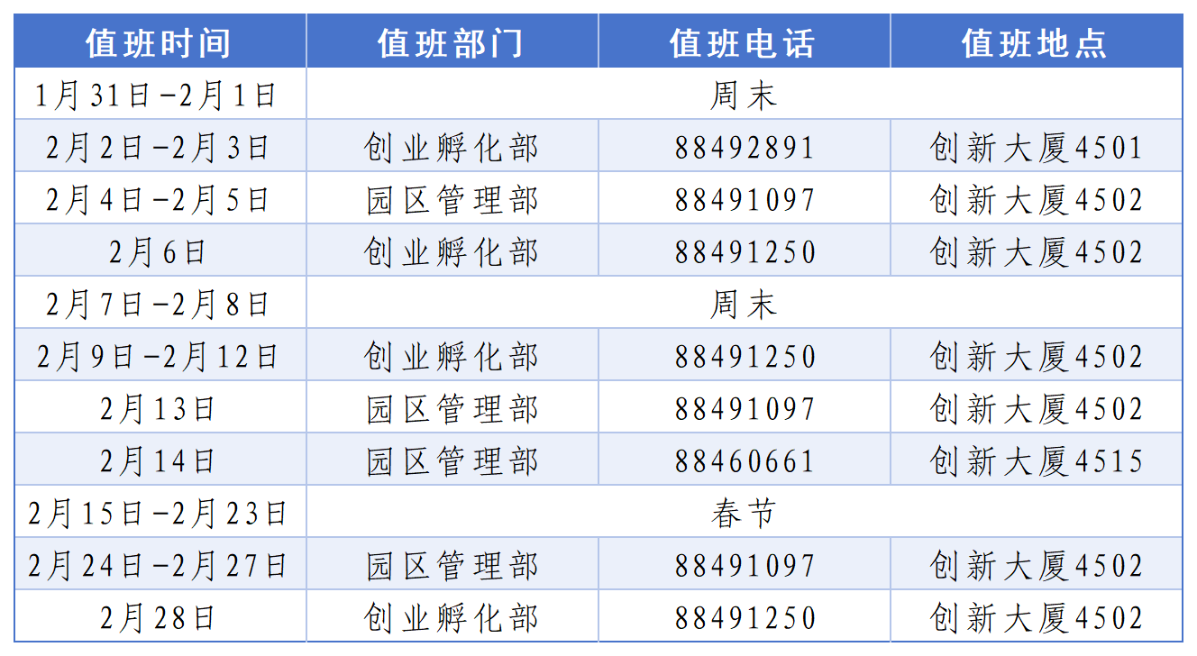 1.创业孵化部、园区管理部2026年寒假值班安排: