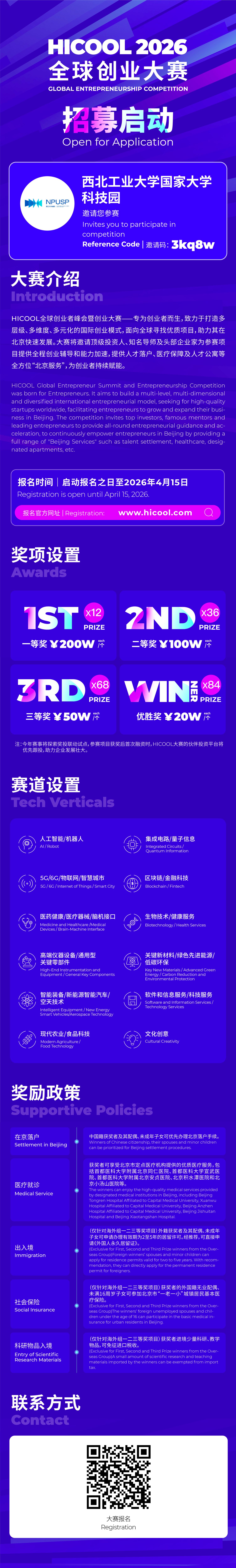 HICOOL全球创业大赛是面向全球创业者的标杆赛事,旨在寻找和培育顶尖的创业项目。大赛每年举办一届,已连续举办六届,累计吸引来自167个国家和地区的4.5万名创业人才、3.4万个优质项目参赛,成功孵化4家上市公司、16家独角兽企业和197家专精特新企业,获奖项目赛后融资总额突破651亿元,构建了大赛、峰会、管家、商学院、产业园、基金及数字化平台为一体的创业生态。大赛现已正式启动,分为HICOOL 2026全球创业大赛、HICOOL 2026青年创业梦想计划,报名截止日期为2026年4月15日。